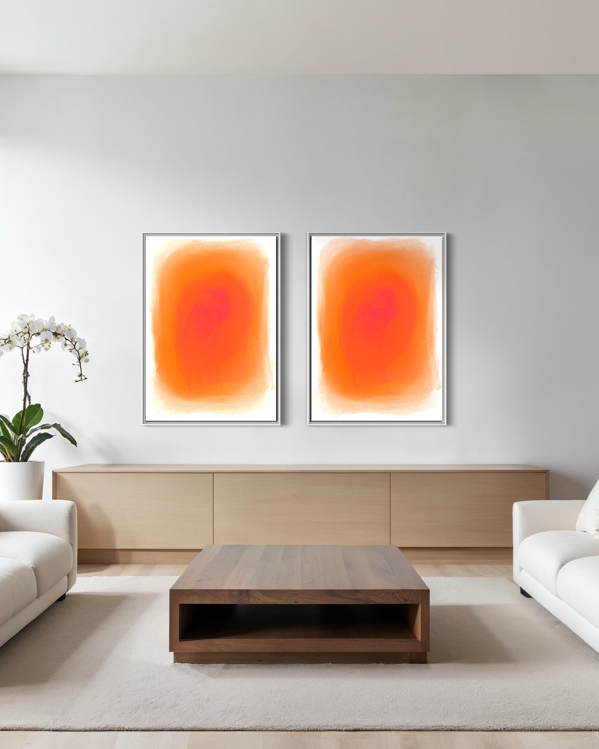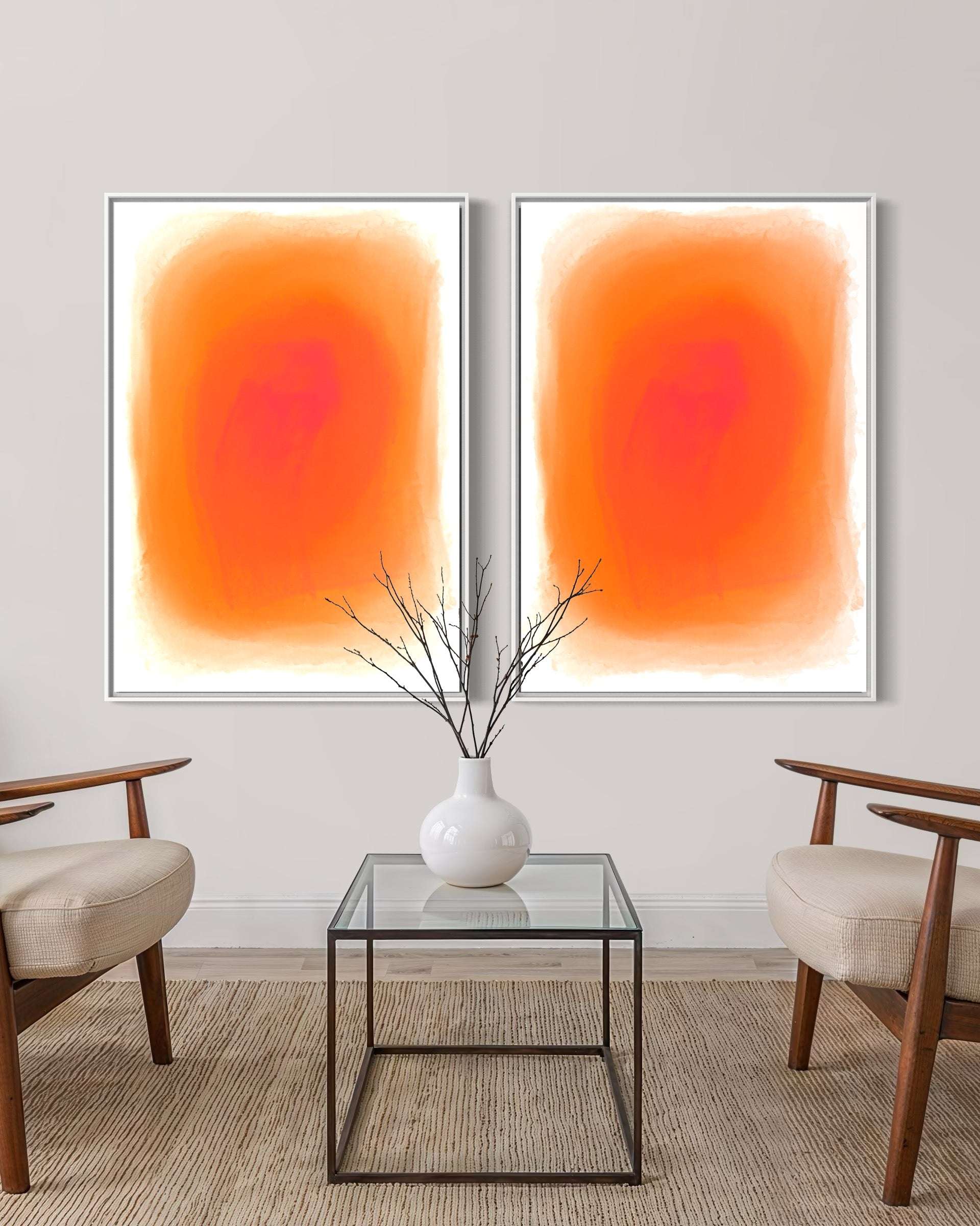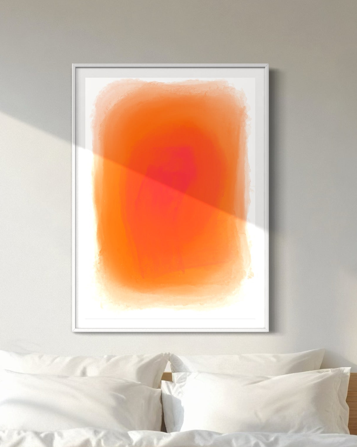 Infuse your space with warmth and energy through BURNING DAWN, a mesmerizing abstract artwork that radiates with the intensity of a burning ember. Featuring a rich gradient of fiery orange tones that softly dissolve into the surrounding white canvas, this piece exudes a sense of movement, depth, and tranquillity. Its watercolour-like textures create a luminous effect, drawing the viewer into its glowing core.
