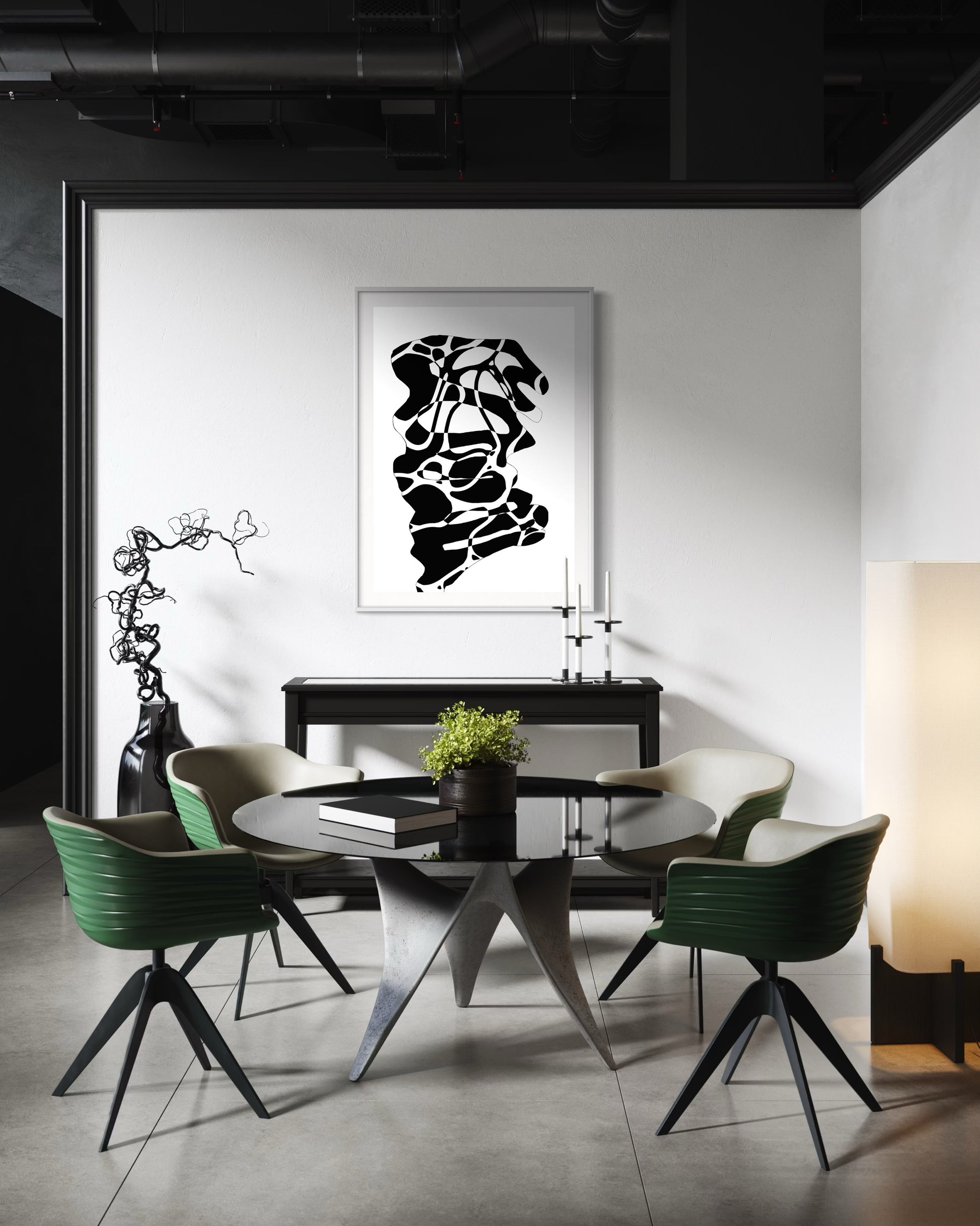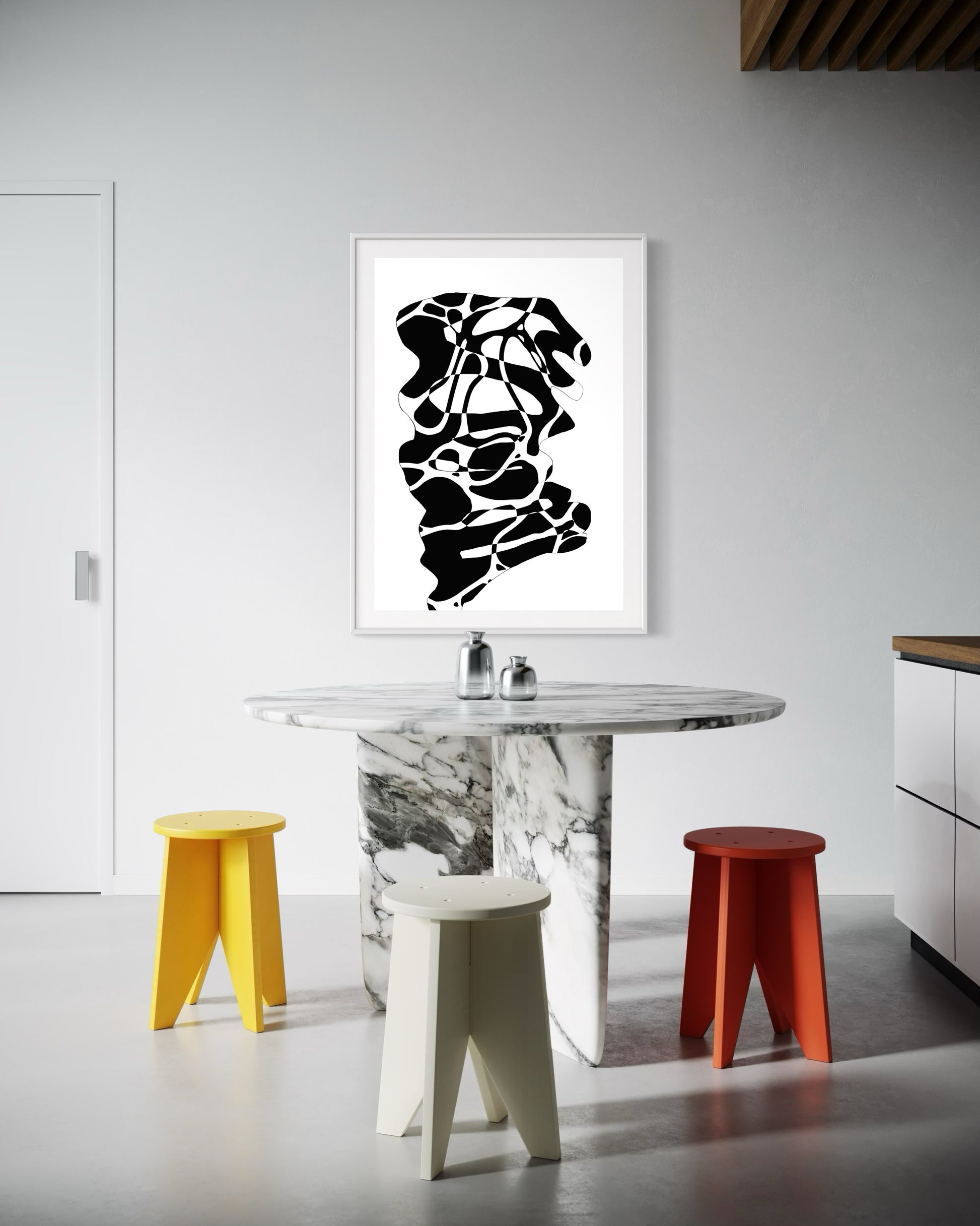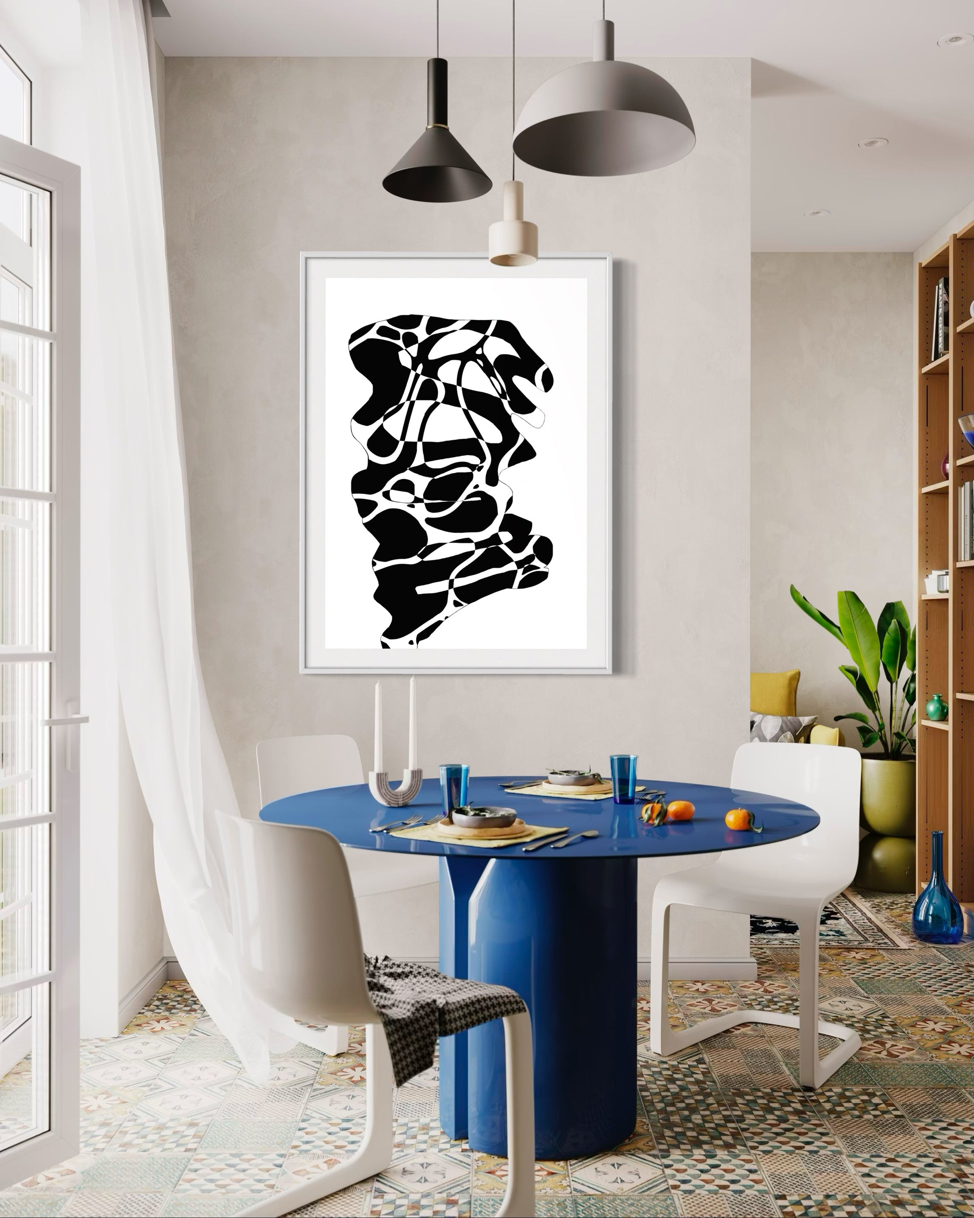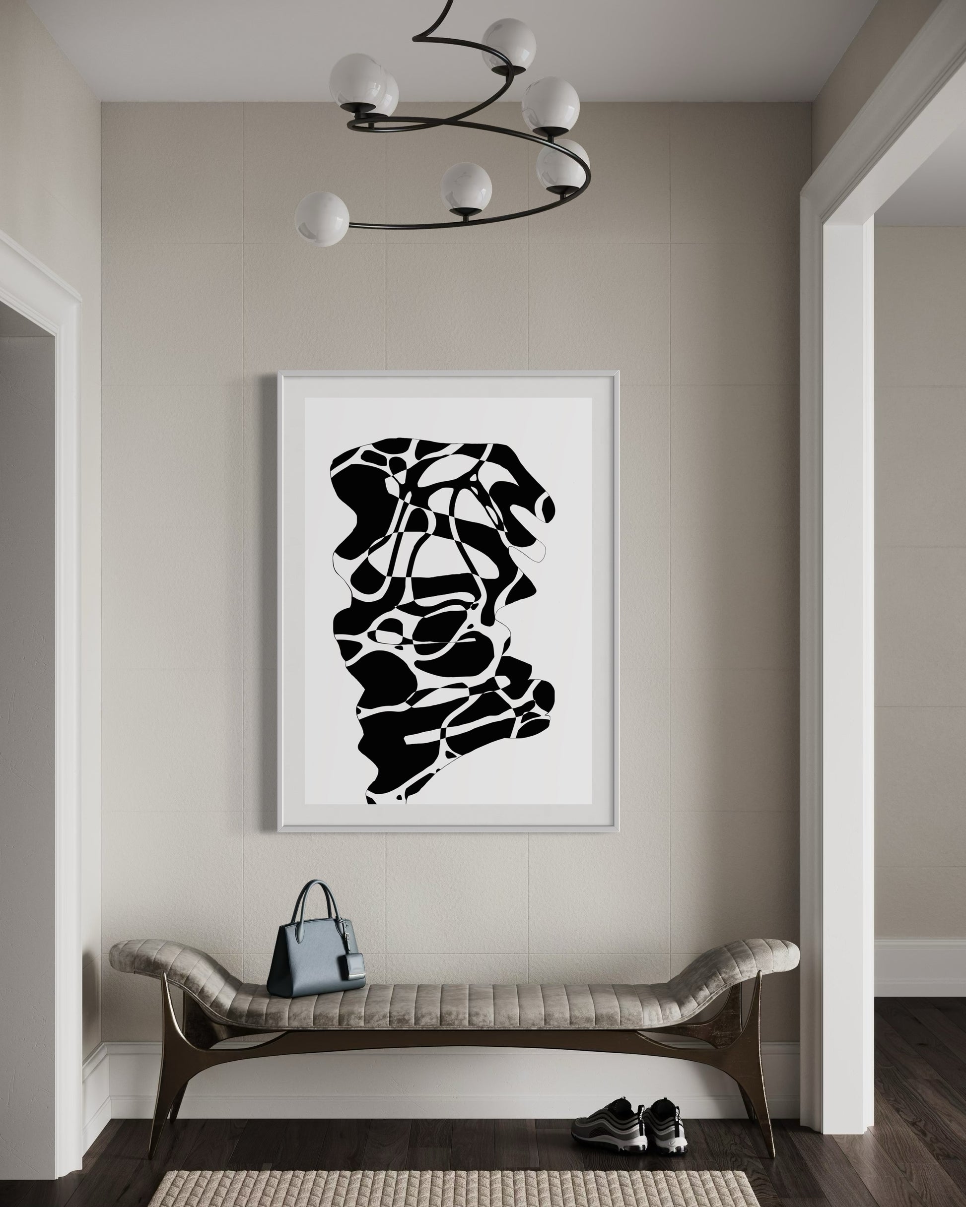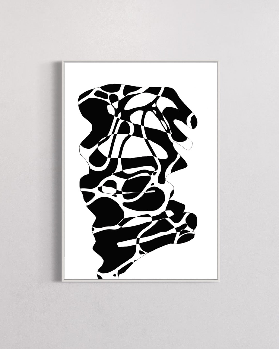 "Contours of a Thought" captures the nonlinear rhythm of inner dialogue — layered, looping, and open to interpretation. The high-contrast composition plays with negative space and density, resulting in a piece that feels both organic and controlled.