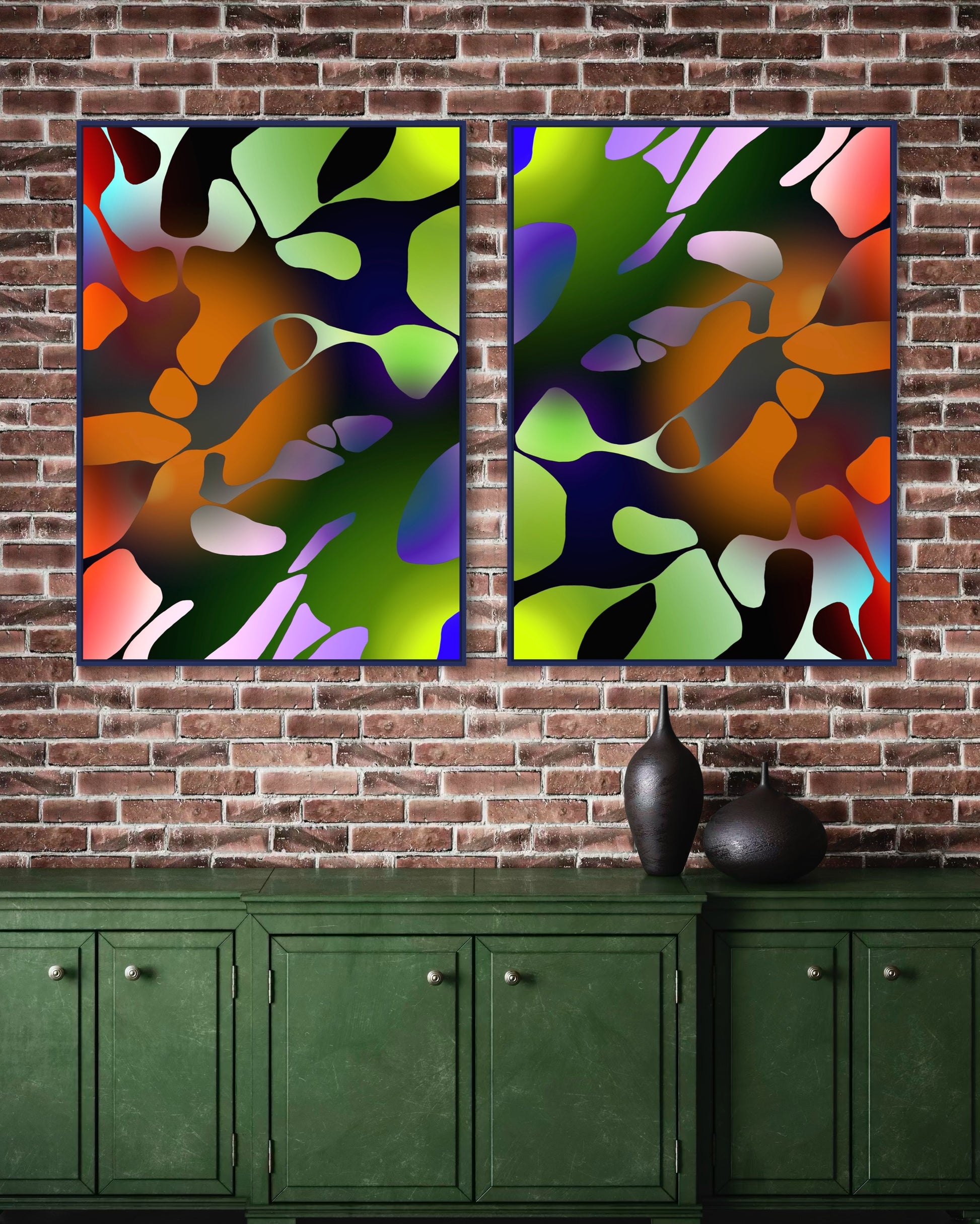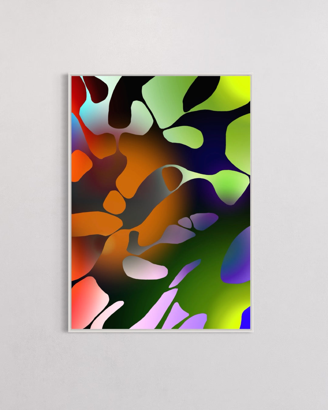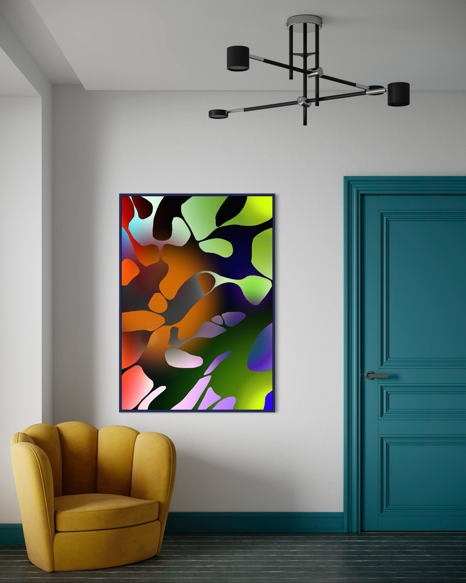 ORGANIC REFLECTIONS V4 is a bold and dynamic abstract artwork that merges fluid organic shapes with a spectrum of deep greens, fiery oranges, electric purples, and glowing yellows. The flowing forms create a sense of constant movement—like light filtering through nature, reimagined in a futuristic lens.