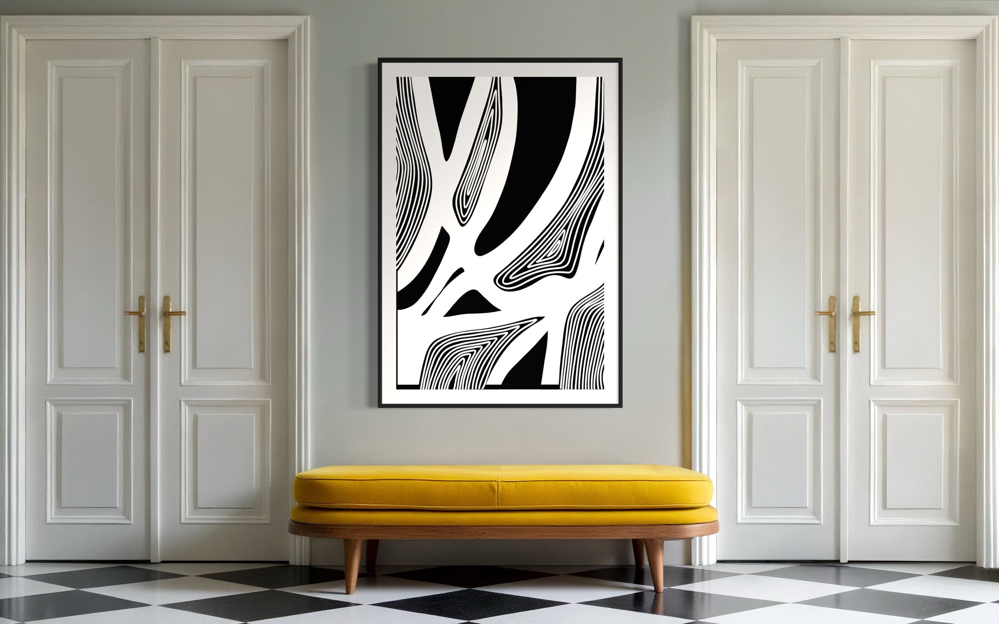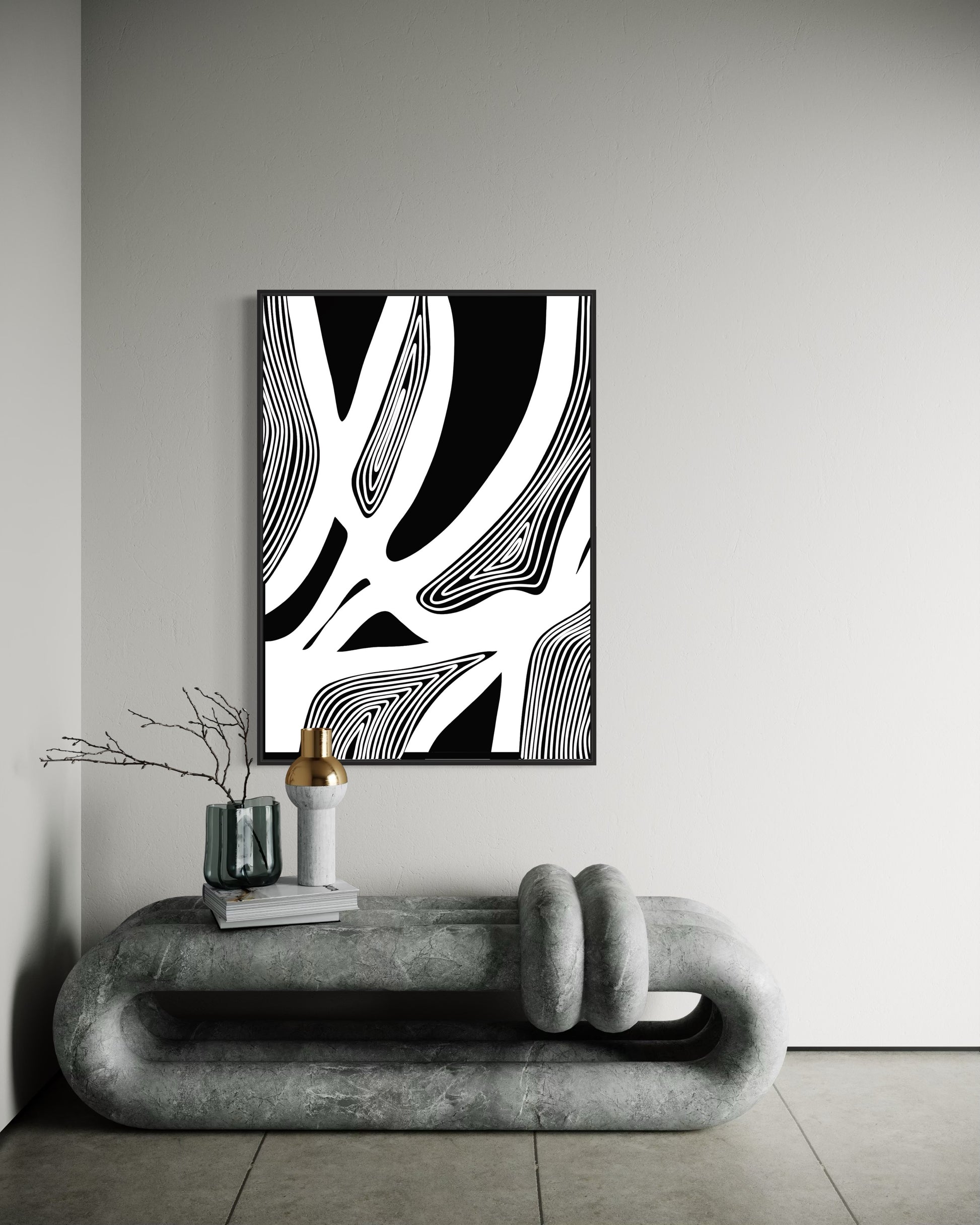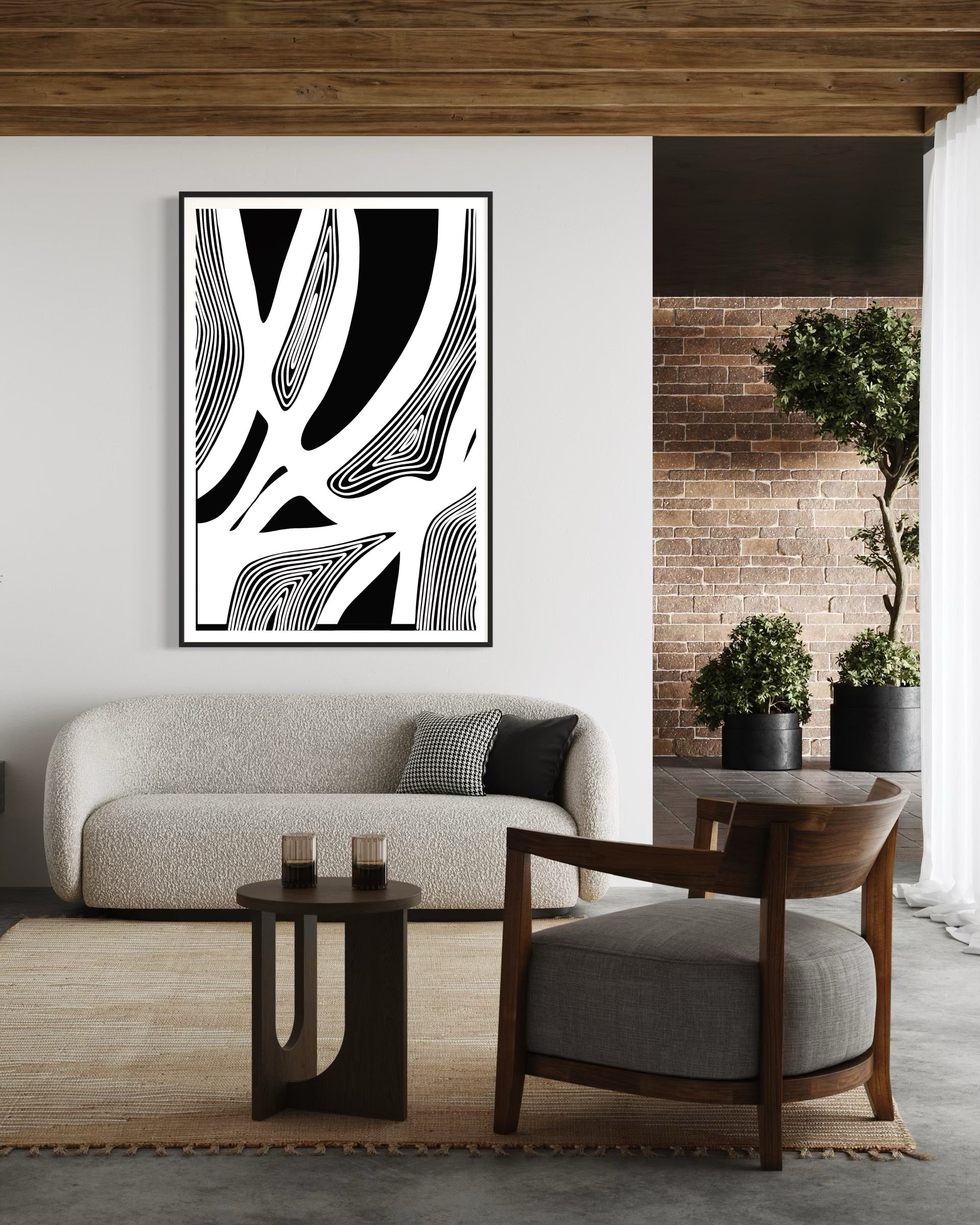 "Unruly Lines P2" is part of the Unruly Lines black-and-white abstract collection. Originally one artwork, it was divided into four equal parts, creating a series that explores fluid movement and bold contrast. Flowing, curvilinear lines twist and fracture across the canvas, forming a dynamic composition that captures both energy and balance. The intricate details and high-contrast design make this piece a striking focal point.