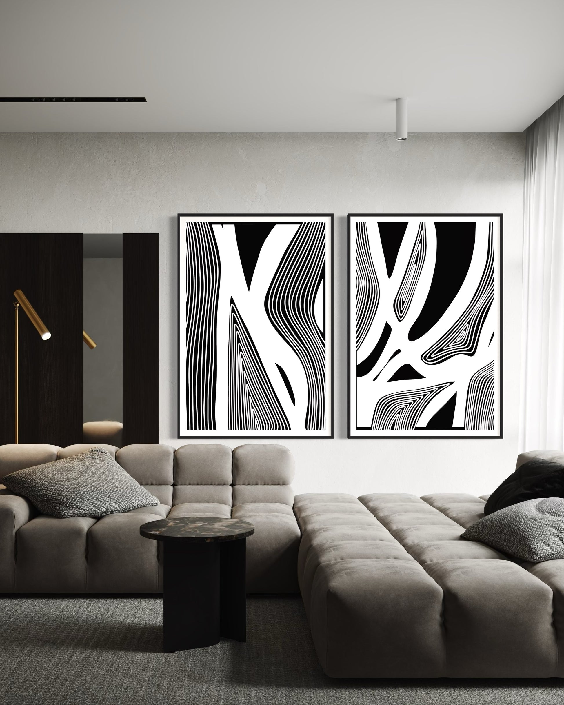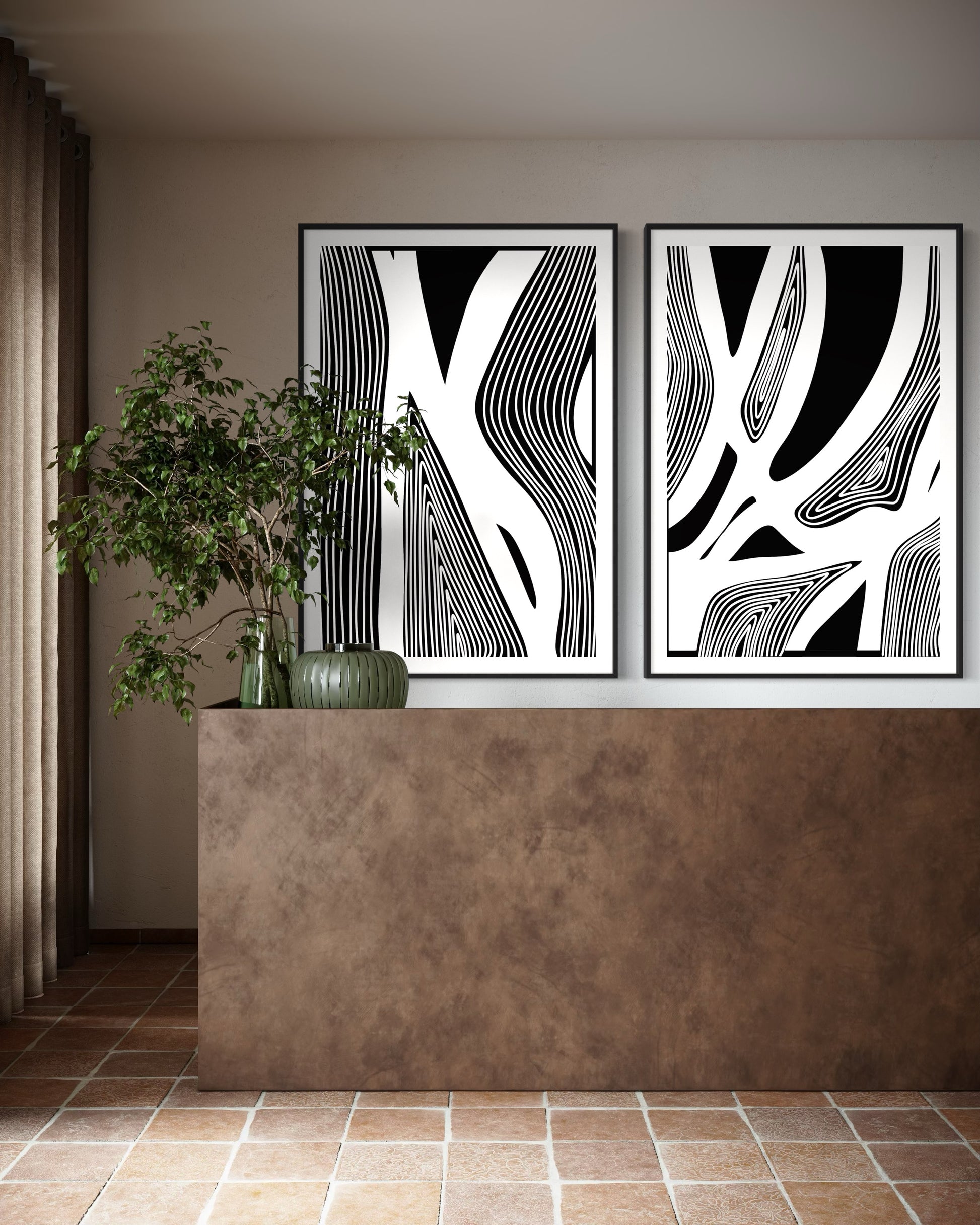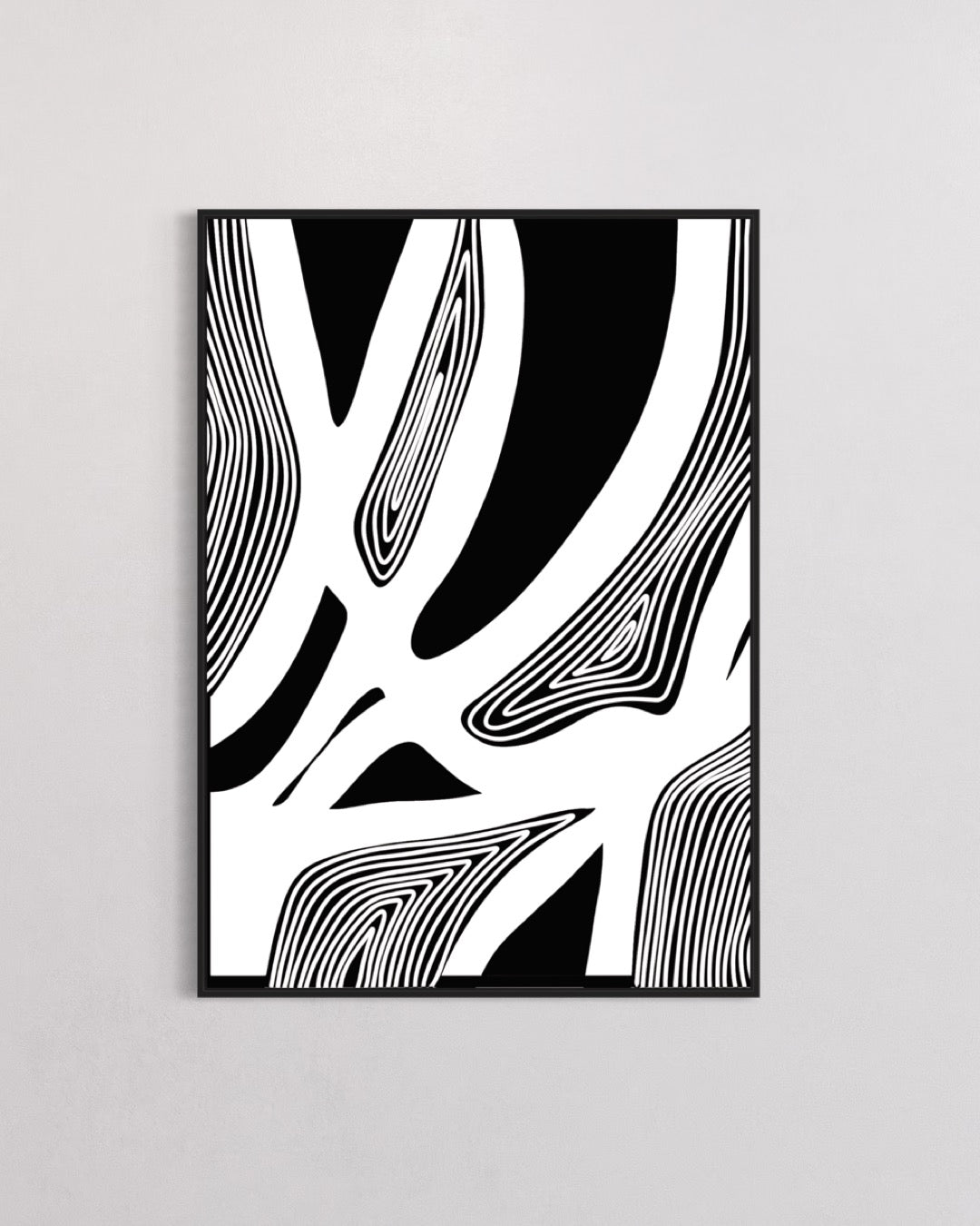 "Unruly Lines P2" is part of the Unruly Lines black-and-white abstract collection. Originally one artwork, it was divided into four equal parts, creating a series that explores fluid movement and bold contrast. Flowing, curvilinear lines twist and fracture across the canvas, forming a dynamic composition that captures both energy and balance. The intricate details and high-contrast design make this piece a striking focal point.