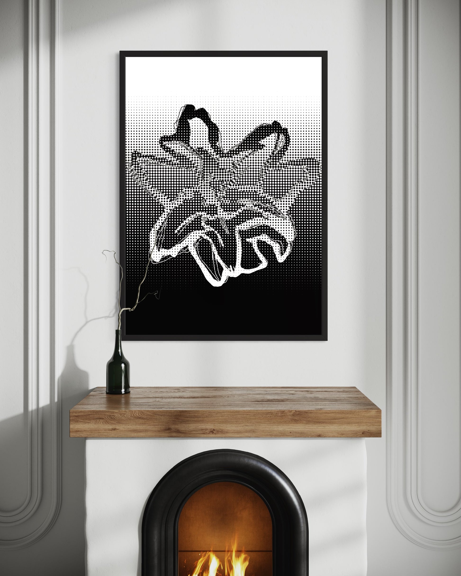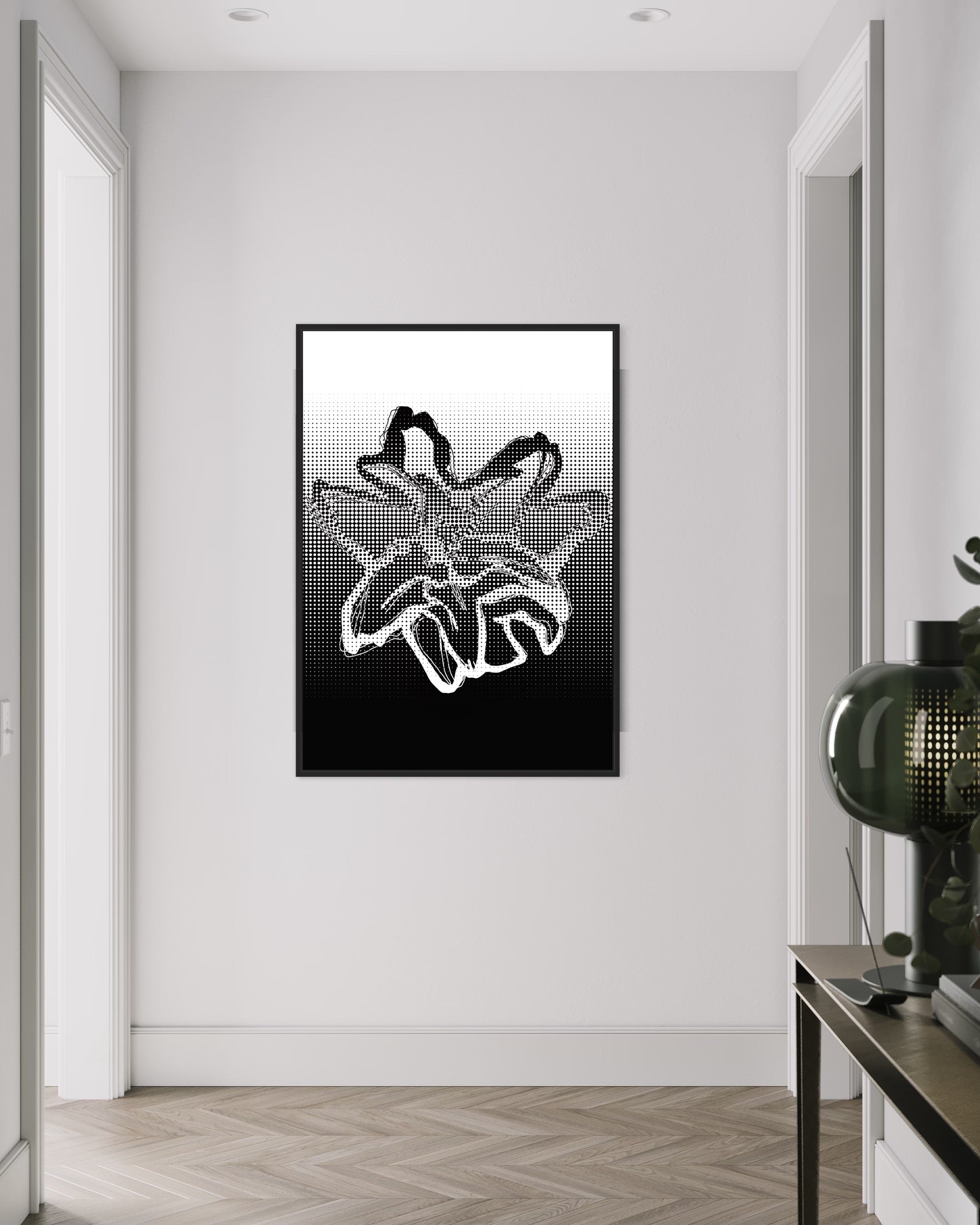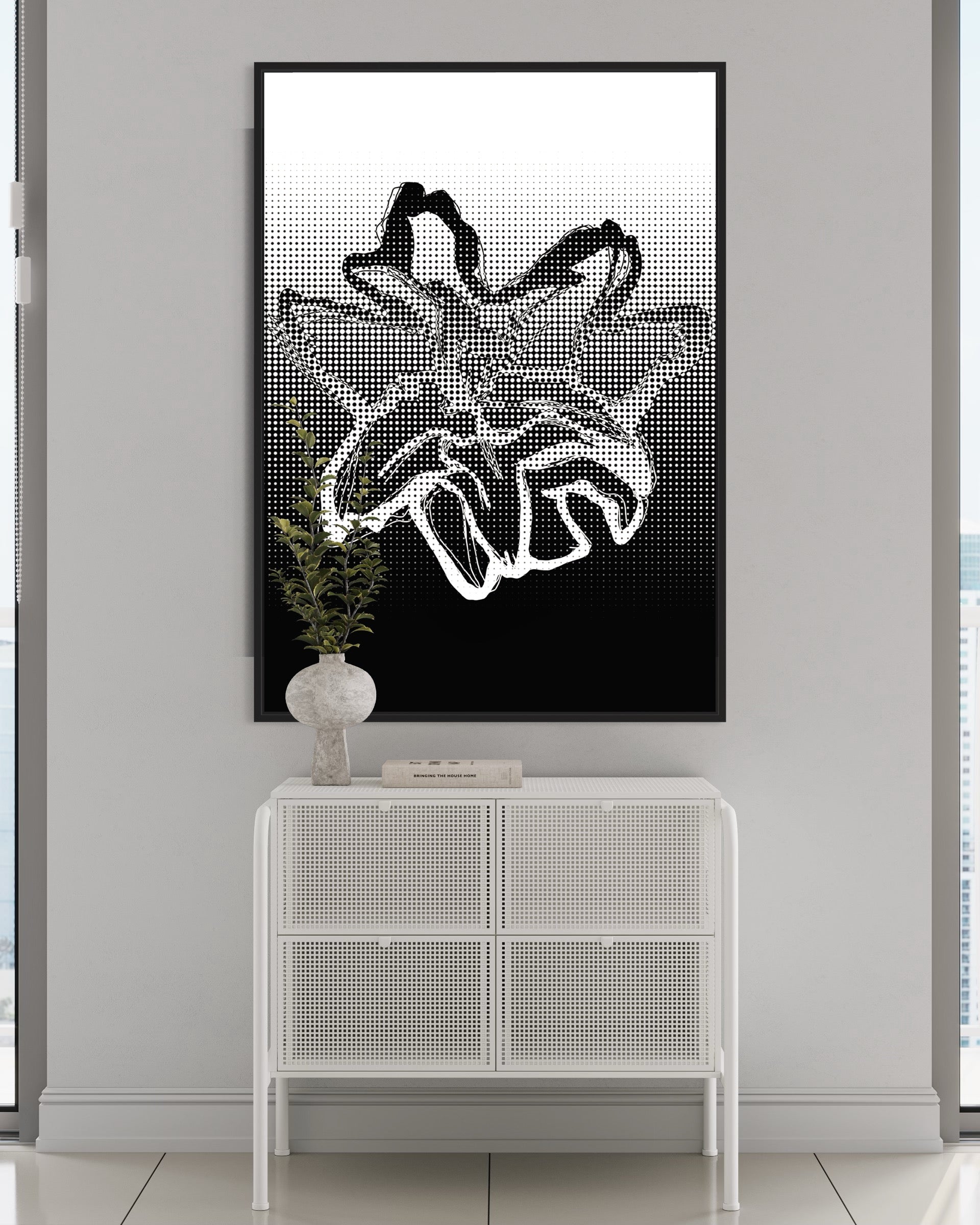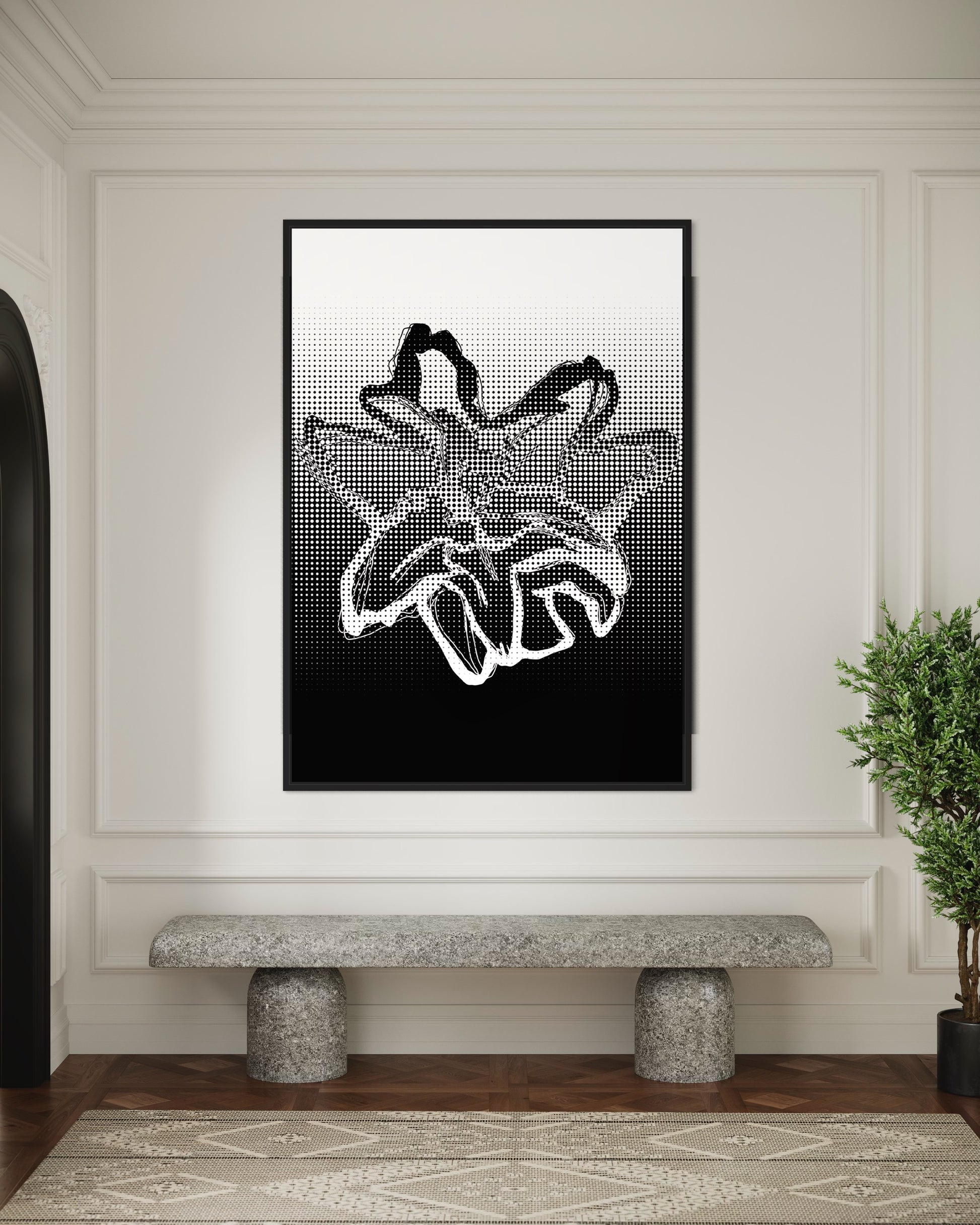 Transform your space with "Ethereal Bloom", a mesmerising artwork that combines bold monochromatic contrasts with delicate, organic forms. This piece features a striking gradient background transitioning from pure white to deep black, against which a dynamic, flower-like shape emerges in intricate detail. The halftone pattern adds depth and texture, evoking a sense of movement and mystery.
