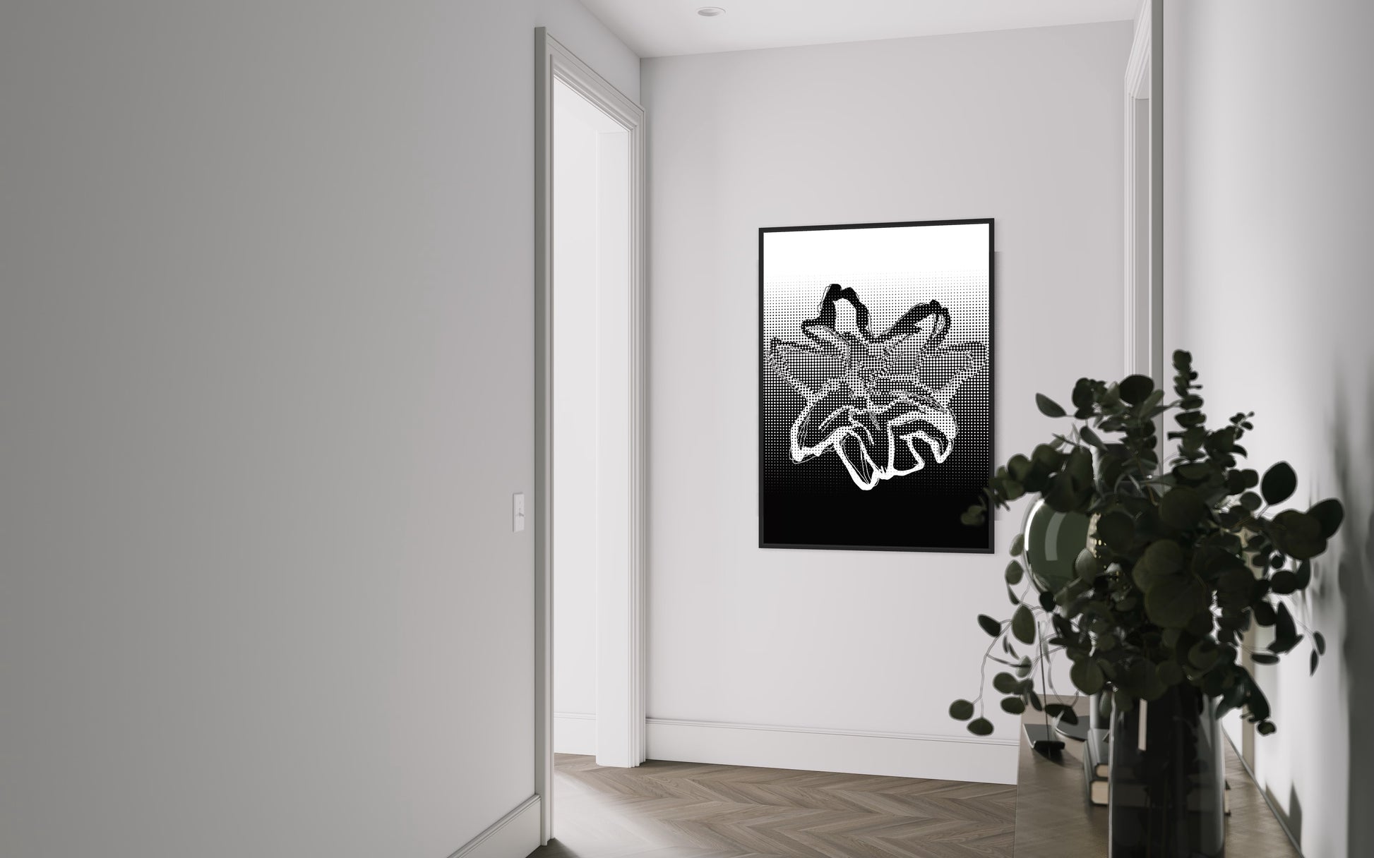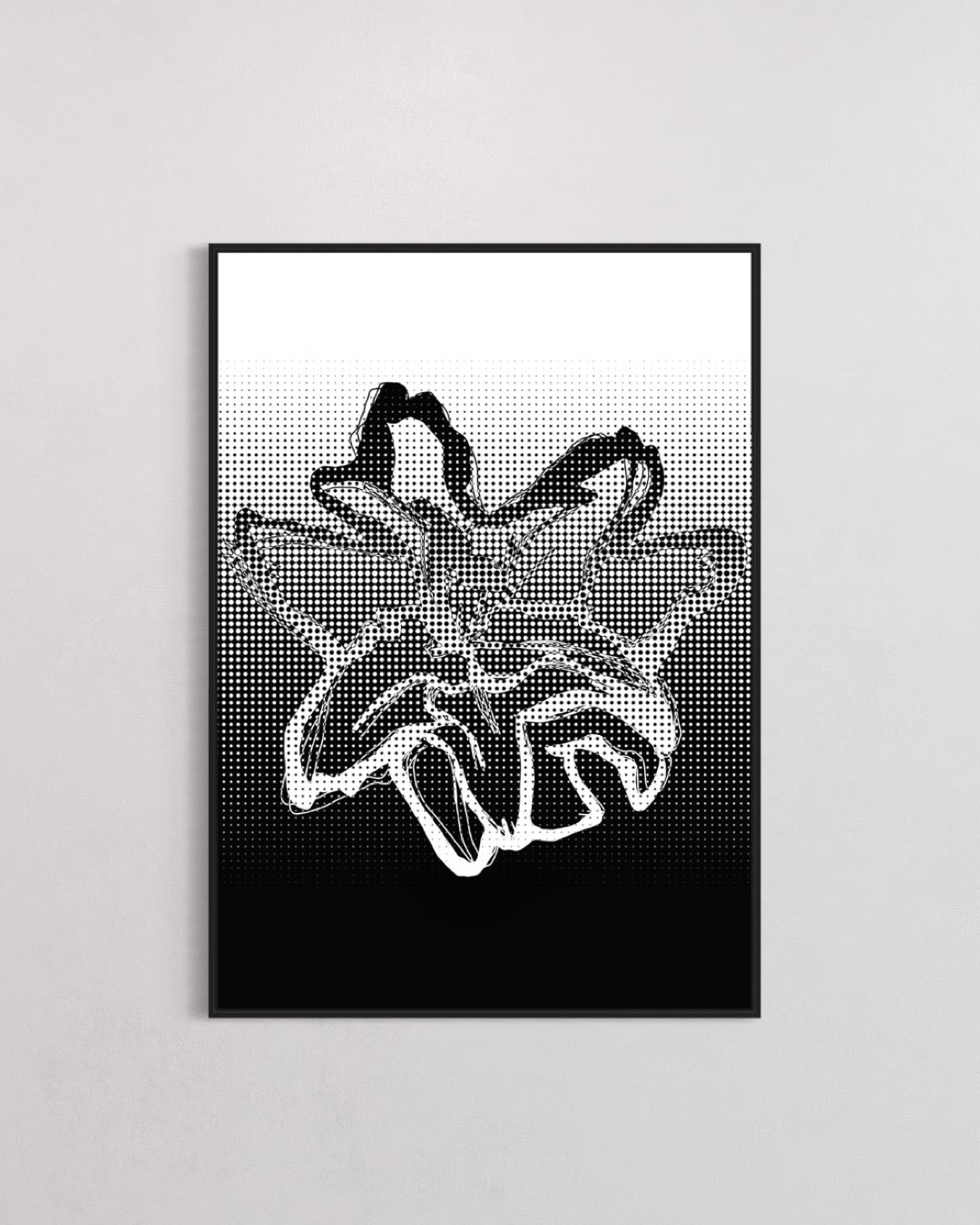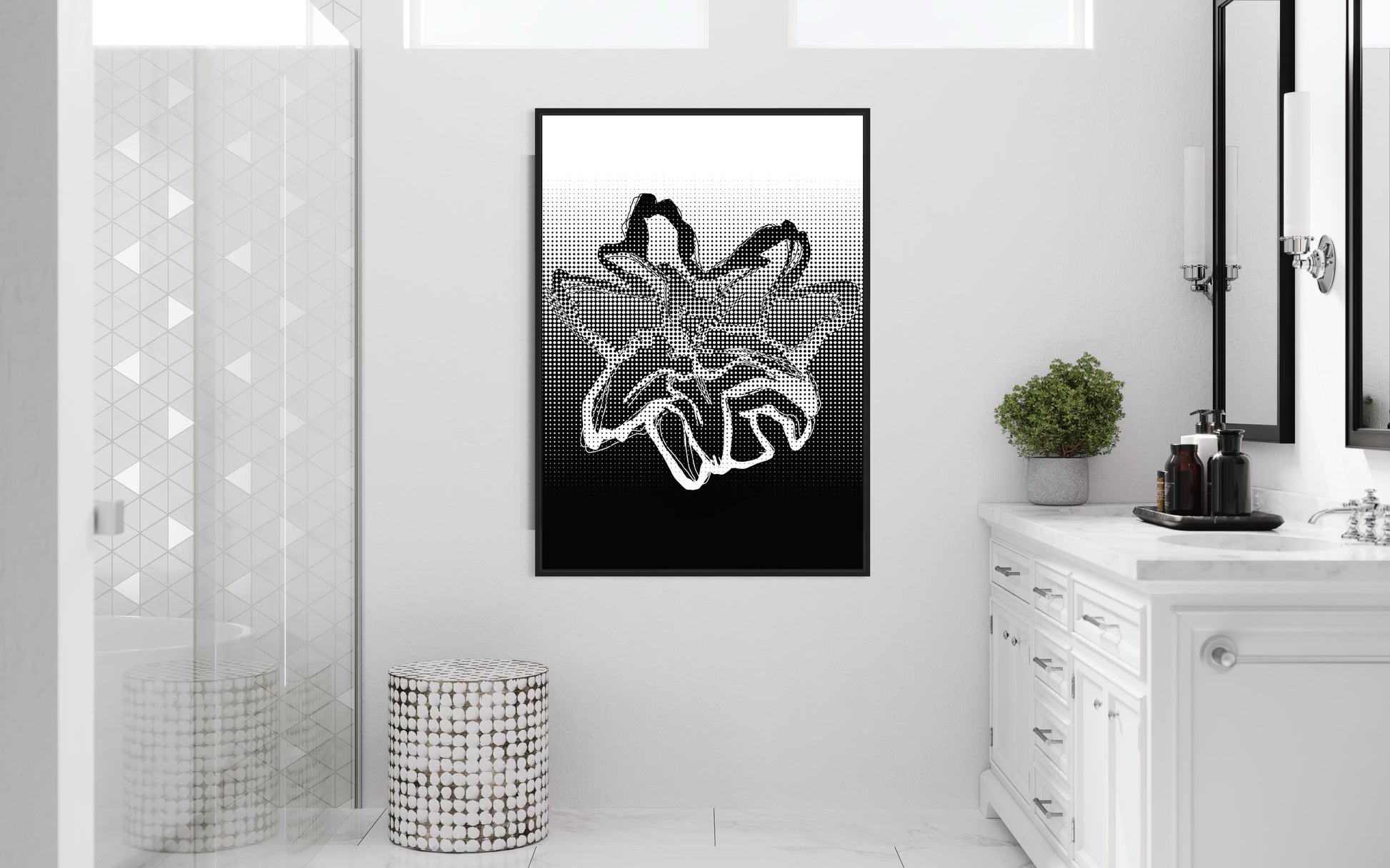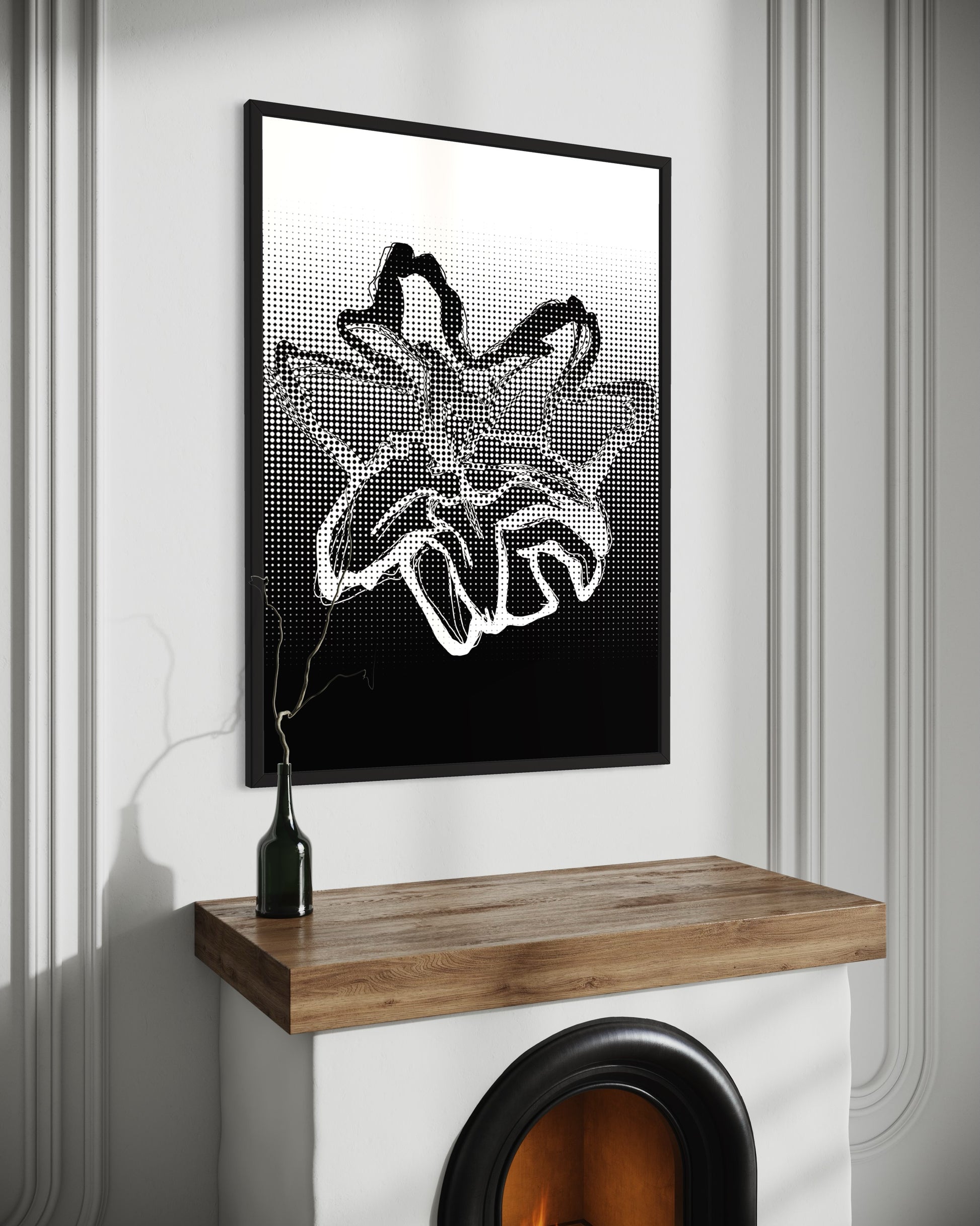 Transform your space with "Ethereal Bloom", a mesmerising artwork that combines bold monochromatic contrasts with delicate, organic forms. This piece features a striking gradient background transitioning from pure white to deep black, against which a dynamic, flower-like shape emerges in intricate detail. The halftone pattern adds depth and texture, evoking a sense of movement and mystery.