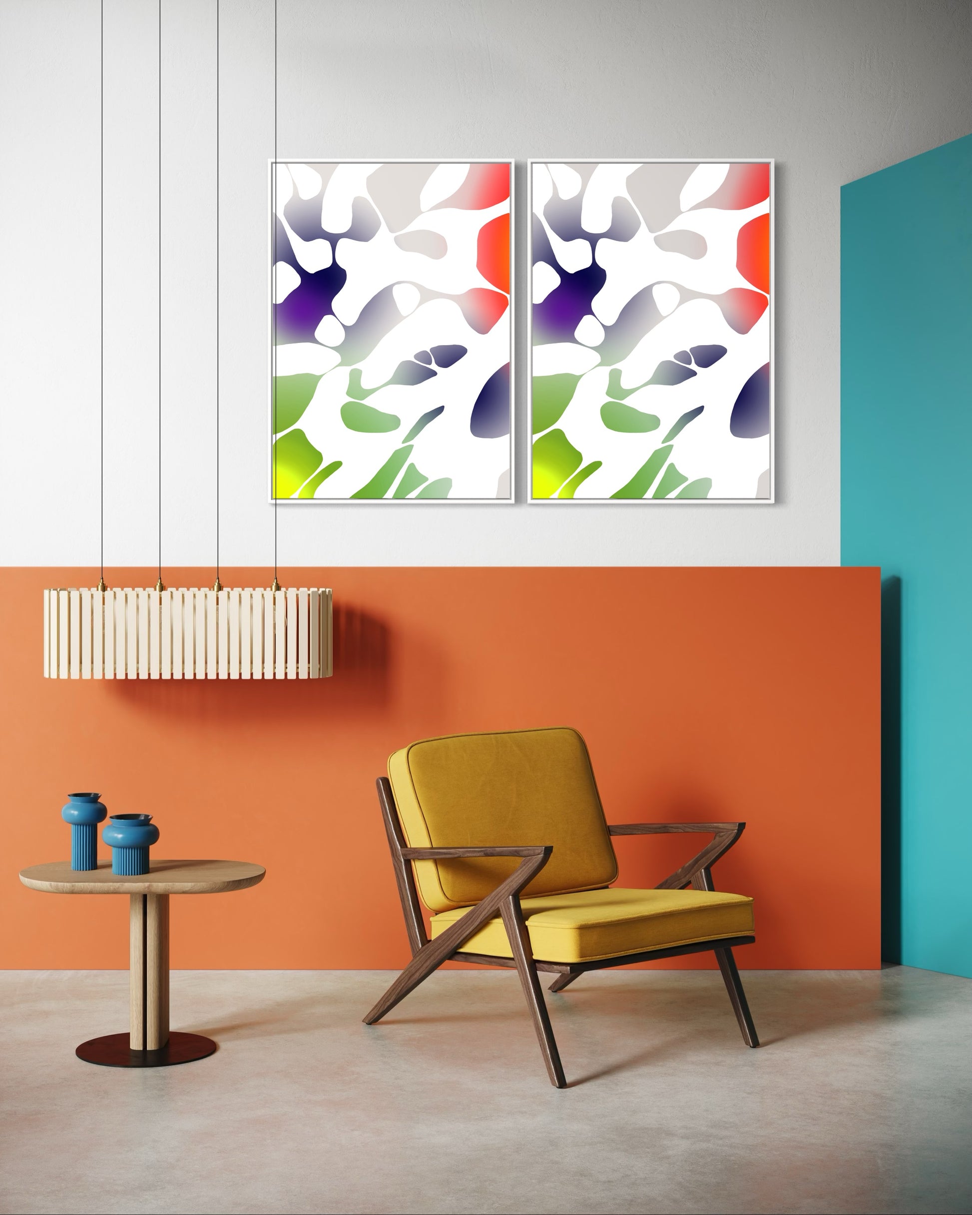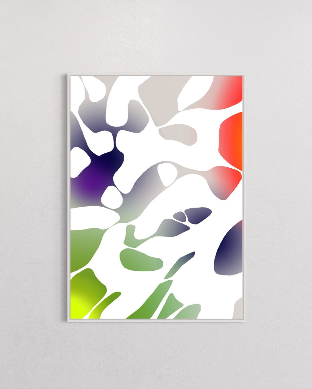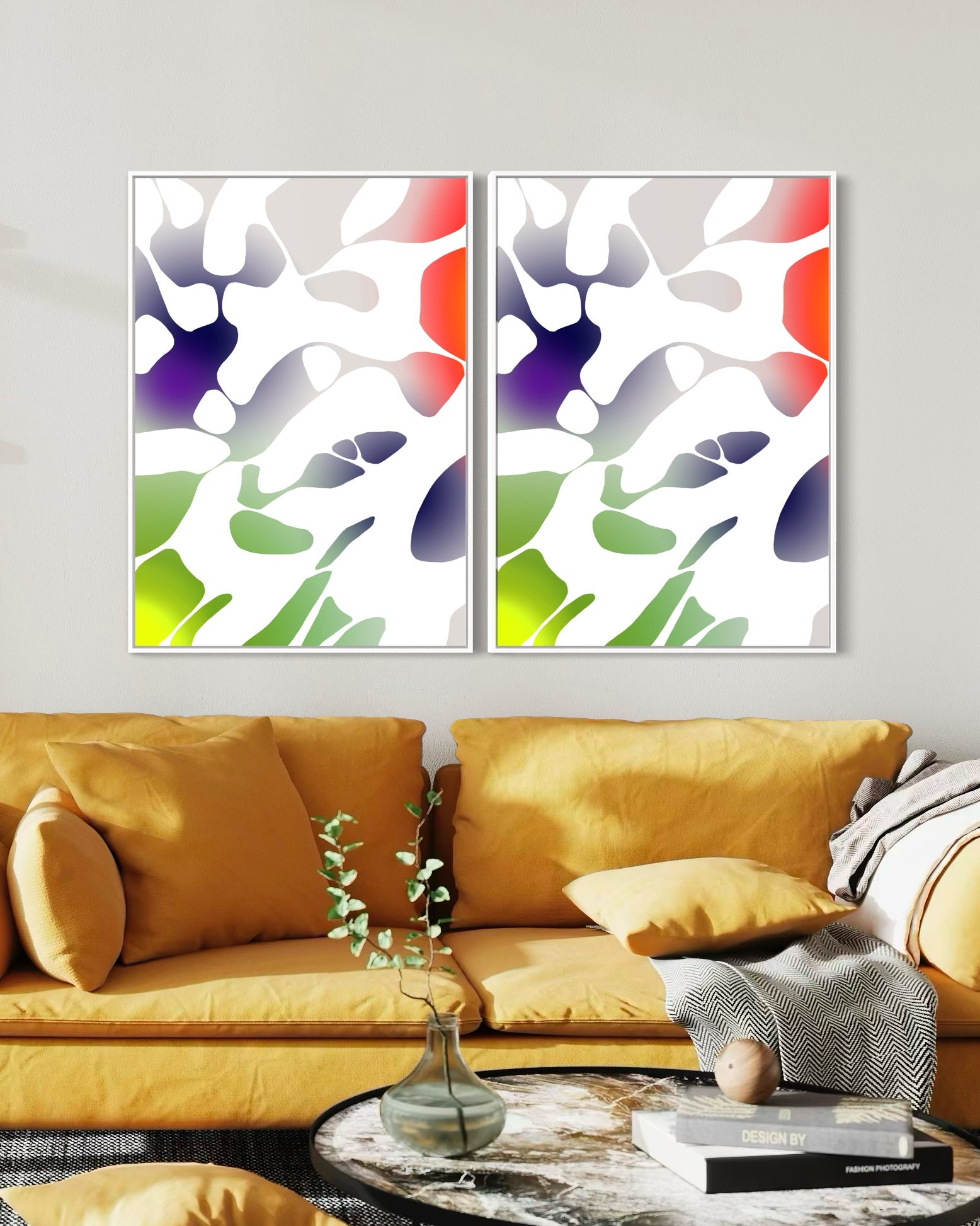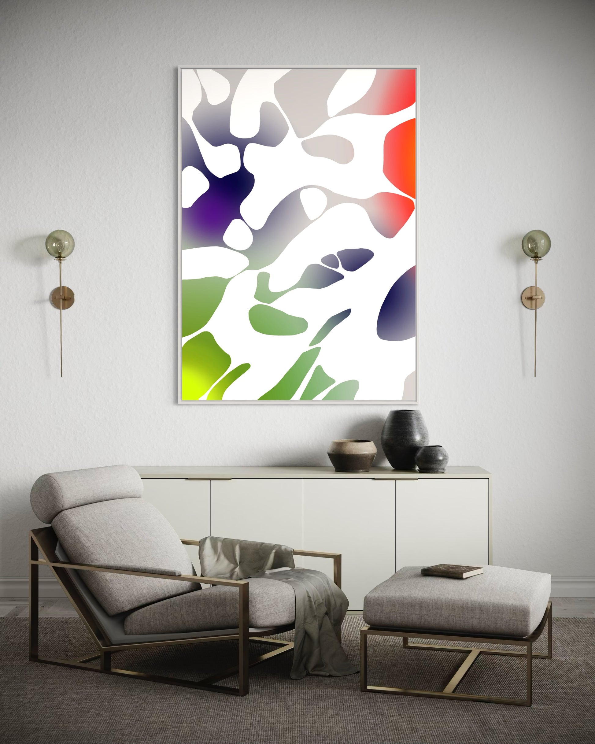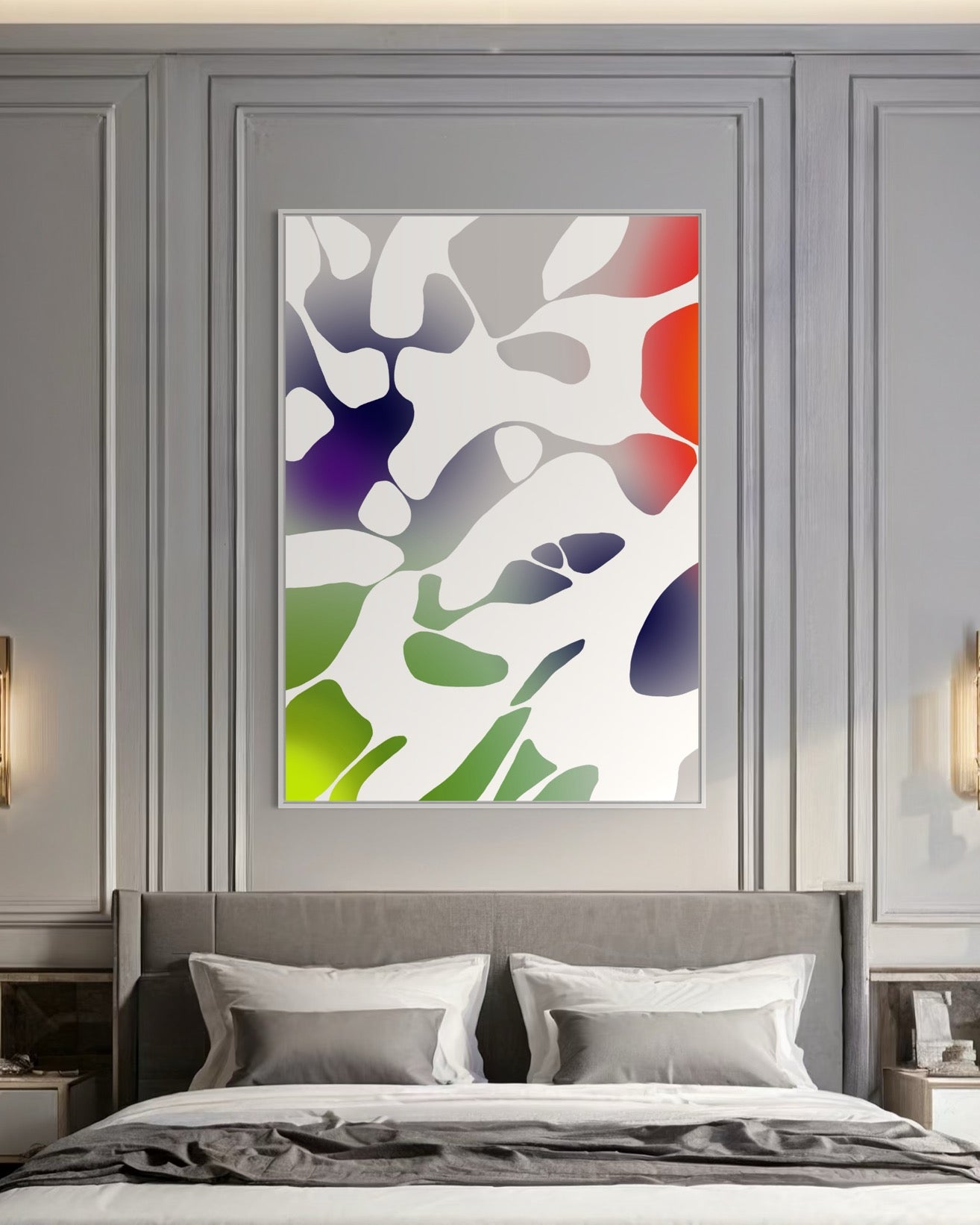 Bring bold movement and modern energy into your space with ORGANIC REFLECTIONS V3. This abstract artwork blends organic forms with vibrant gradients of green, purple, red, and yellow, contrasted by striking negative space. The result is a fluid, contemporary piece that sparks curiosity and adds depth to any room.