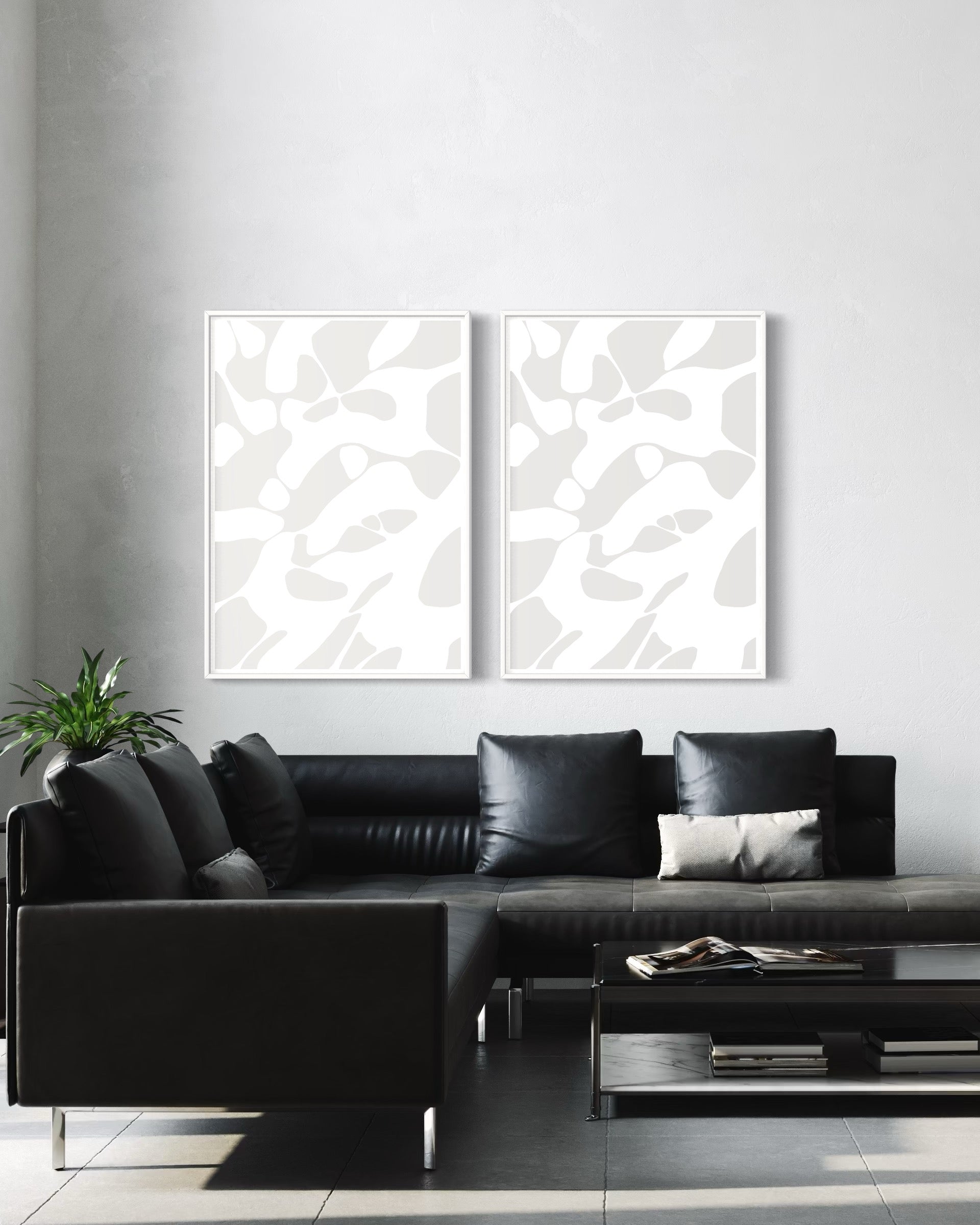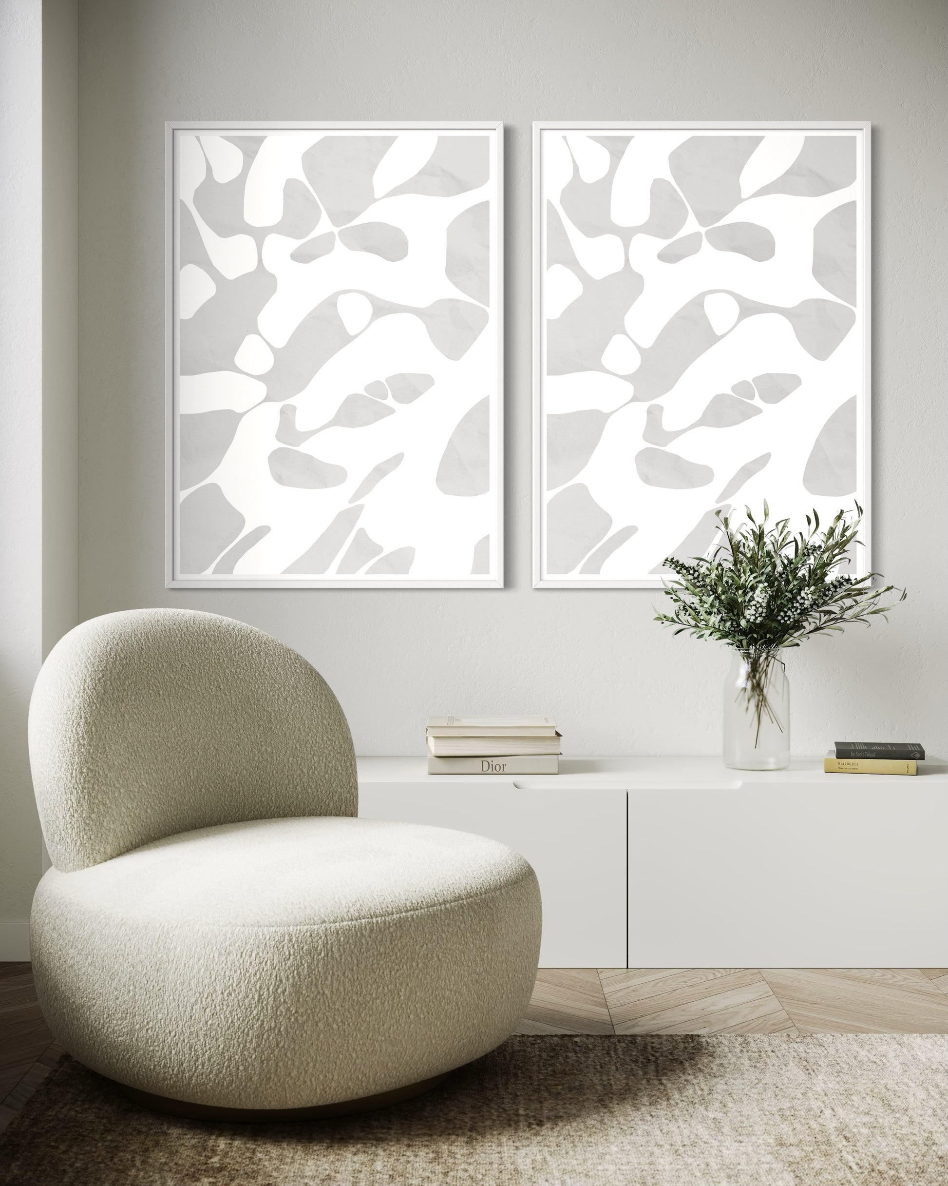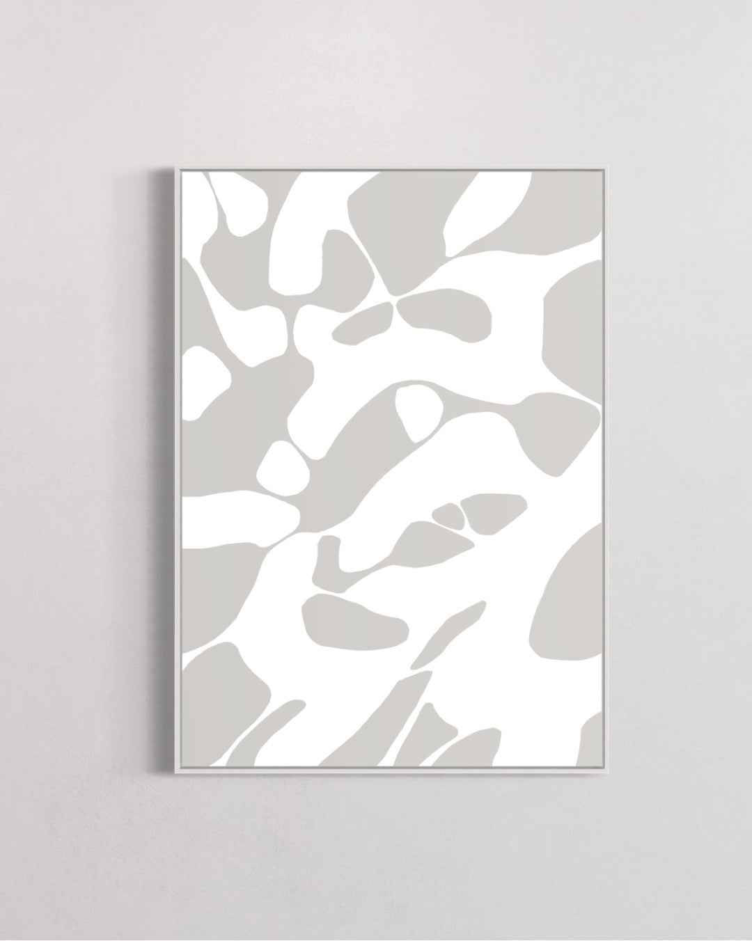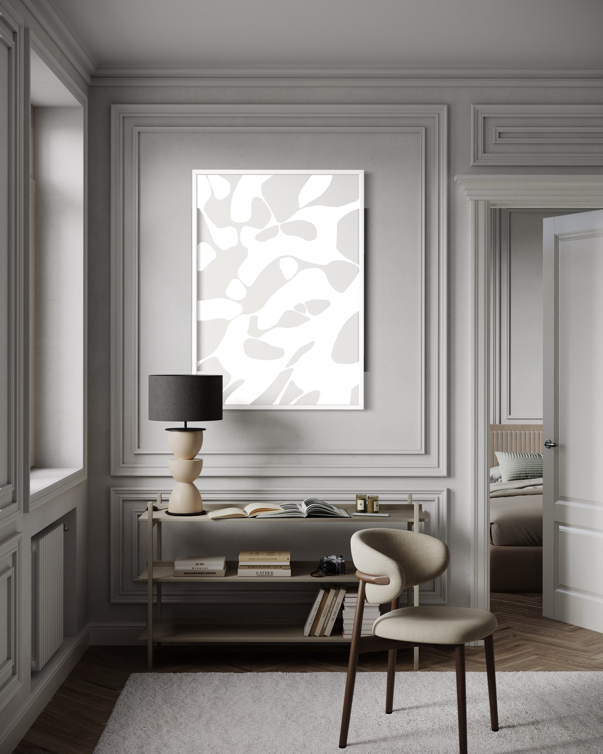 Introduce a touch of modern elegance to your space with "Organic Reflections", a captivating abstract art piece that seamlessly blends soft, flowing forms with a minimalist aesthetic. This artwork features a harmonious interplay of muted grey and crisp white, evoking the beauty of natural patterns while maintaining a contemporary edge.