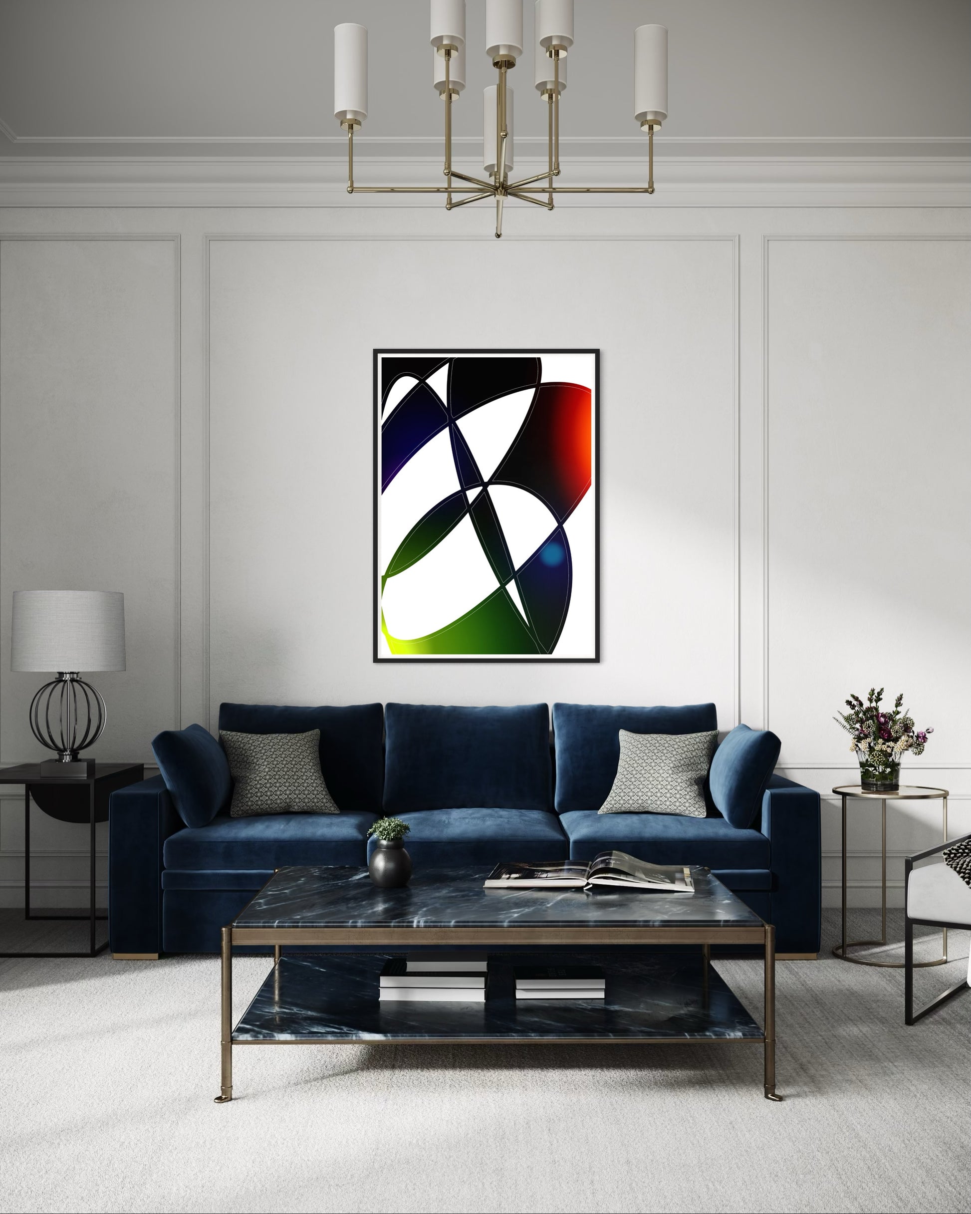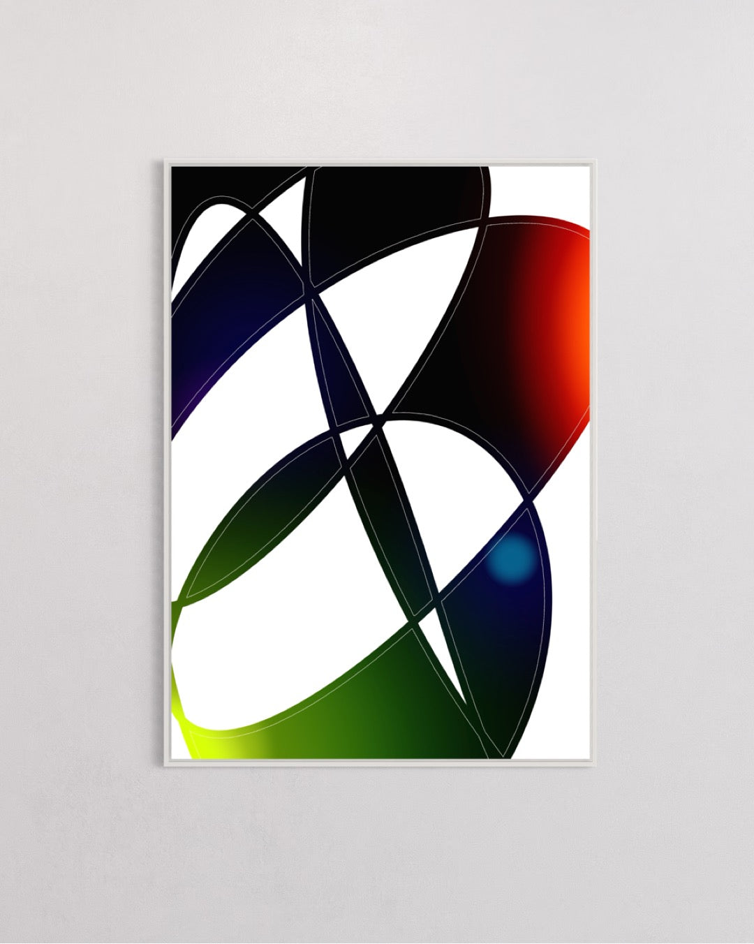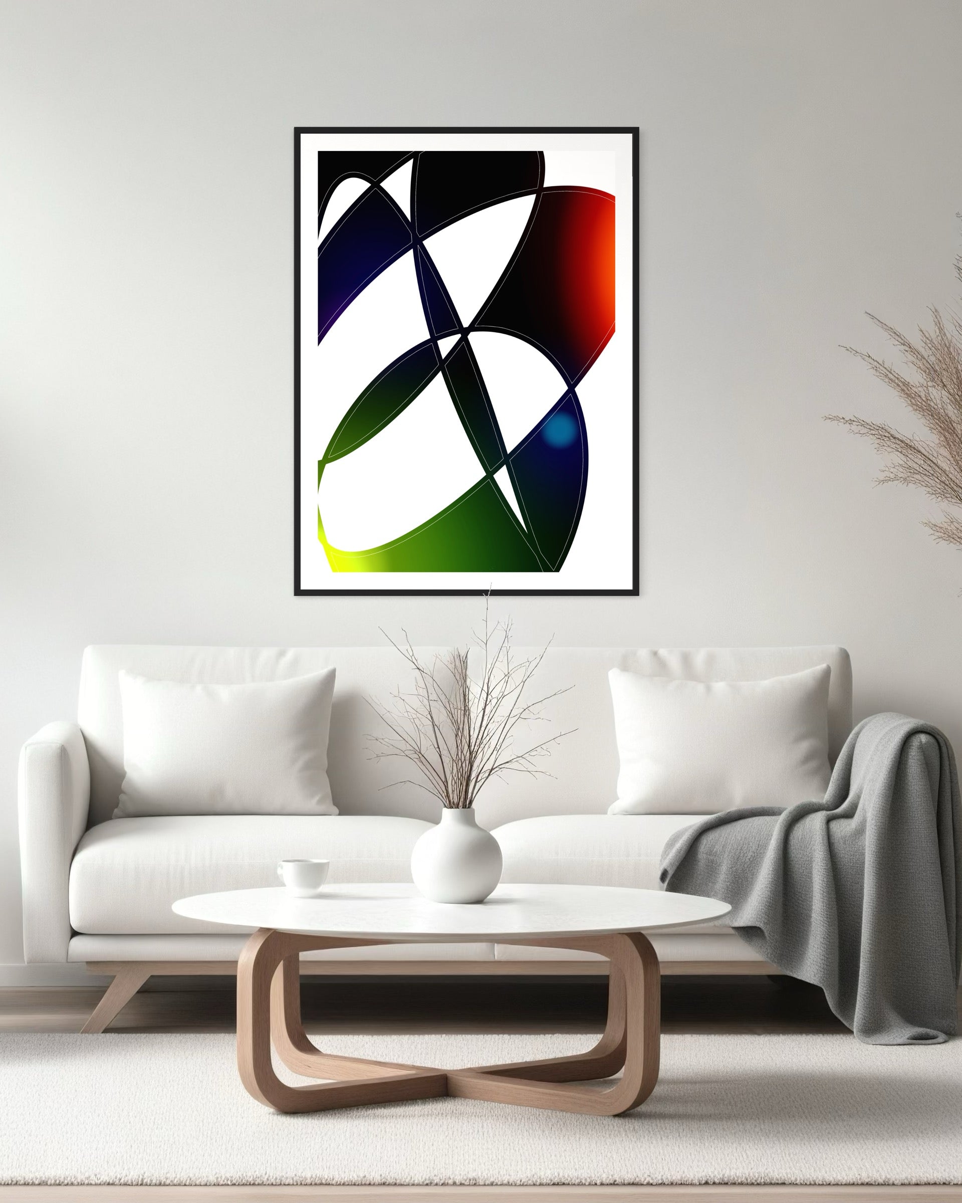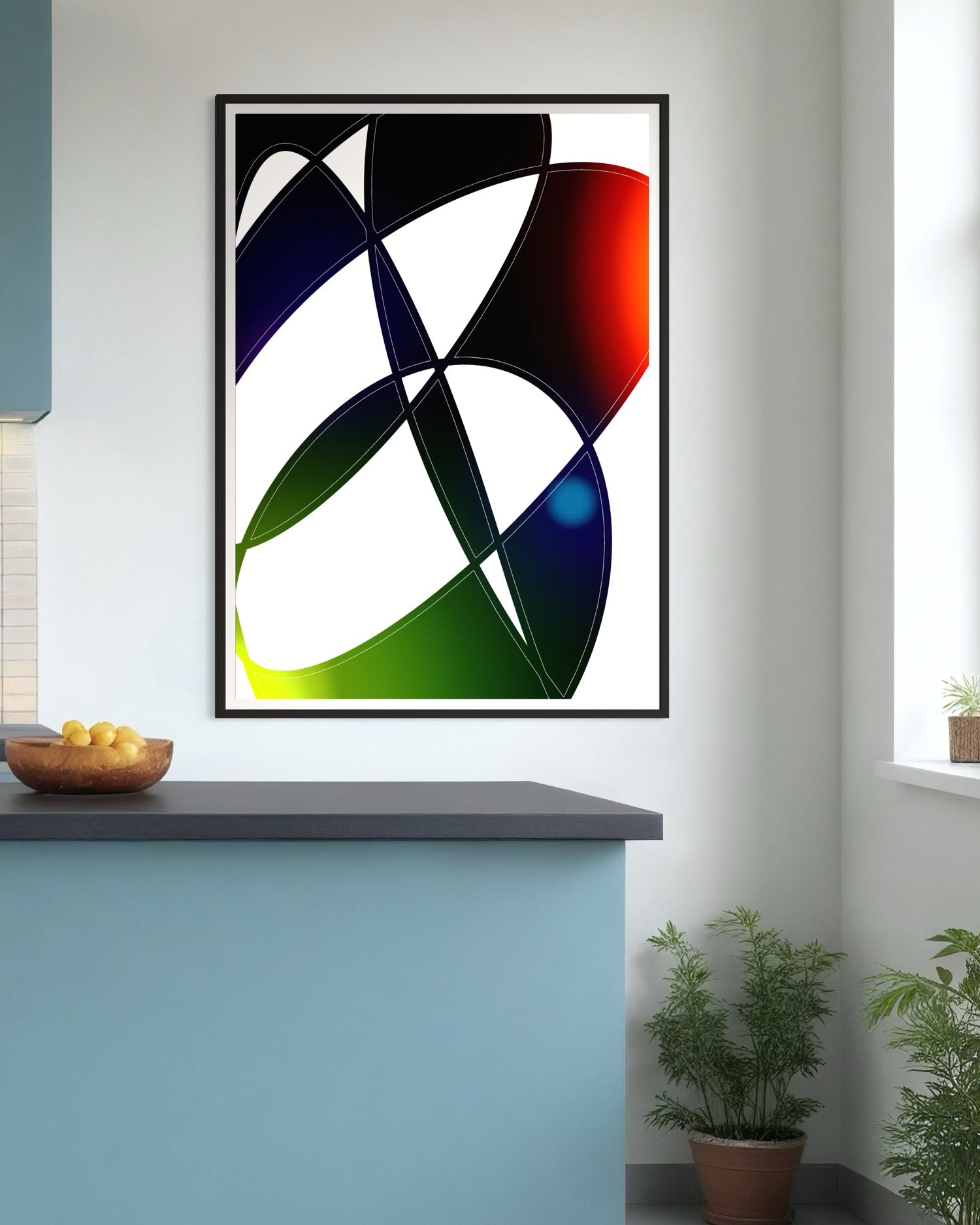 Illuminate your space with "PARALLEL DYNAMICS V2" a striking abstract art print that fuses geometric precision with fluid light and color. This captivating composition features bold intersecting lines and shapes, accentuated by a stunning interplay of luminous gradients—ranging from deep blues and fiery reds to vibrant greens and yellows. The contrast between structured form and dynamic color flow evokes movement, energy, and modern sophistication.